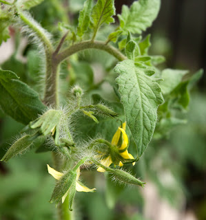 Like the Black Krims, my German Greens have surprised me this week with the development of flowers at least two weeks earlier than I expected. These plants have grown faster and are slightly taller than the Krims (about 15 inches), but I expected them to be much bigger than this before the started moving toward fruit production. Hey--as long as fruit develop successfully, I'm happy. So far there are no fully open blossoms, but the receptacles and sepals are there clustered at the top.DAY 70 - FLOWERING